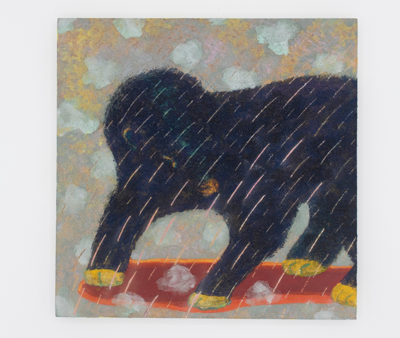 別の絵を描いていた際に余った絵の具を無作為に塗っていたところ、四つ足の動物のようなかたちが浮かんできたため、そこから画面を構成しました。絵の具を重ねていきものの描画を増やせば増やすほどイメージから遠かってしまい、最終的には暗いシルエットのような姿に落ち着きました。カサカサとした画面になってしまったので、雨のような線や、水たまりのような模様を無意識的に加えてバランスをとっているような気がします。