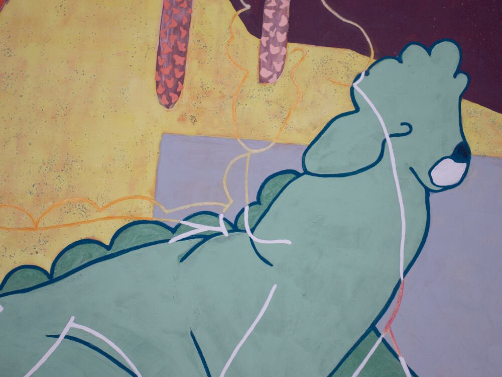 静止している状態に、別角度で動いている線を重ねる、という表現を時々行います。恐竜のようないきものは架空で、特に参考にしたモチーフなどはありません。この絵で描きたかった(捉えたかった)のは、いきもののリアリティではなく静と動がぶつかる空間だったのだと思います。