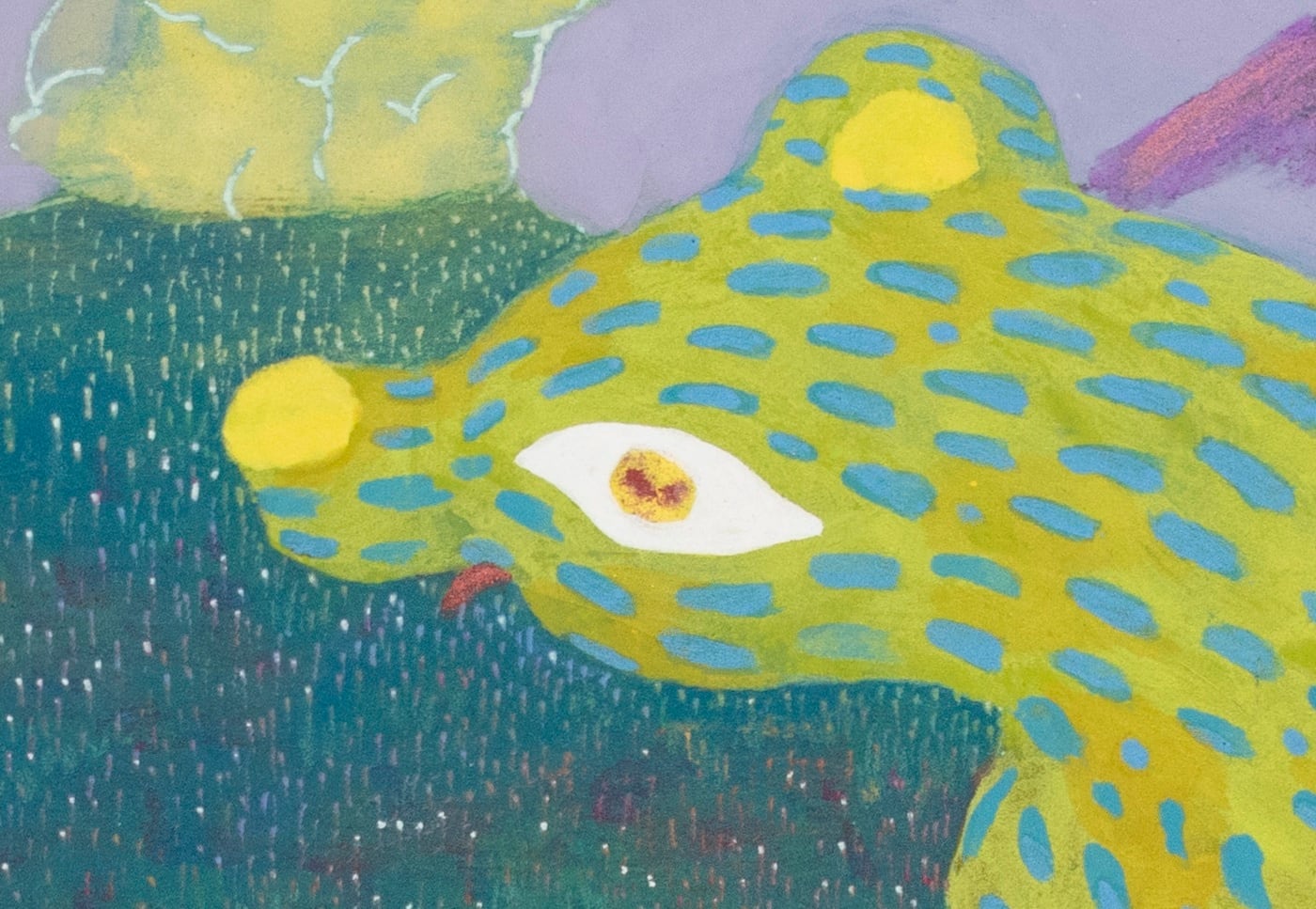 絵の具遊びをしていた際に、噴火する山のようなイメージと、生き物のかたちが浮かび上がったところから、画面を構成して仕上げていきました。