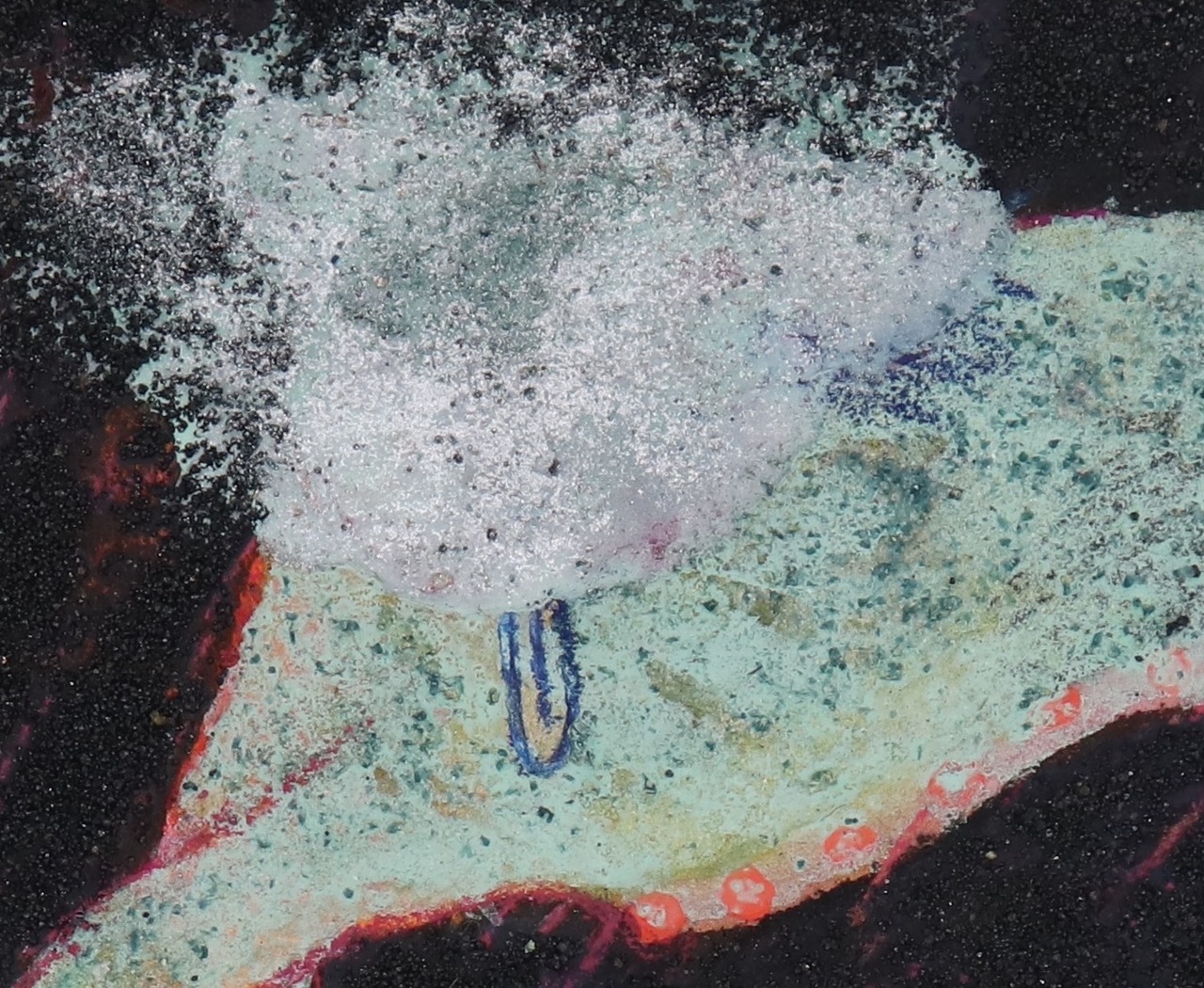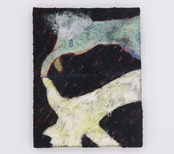14x18cm(F0号)の作品は、大きな作品を描いた時に余った絵の具を塗り重ねながら、はじめは無意識に絵のイメージができていきます。今回は絵の具を重ねているうちに、絵の中に犬のようないきものの形が浮かび上がってきました。その舌には水面のような、影のような黄色いシルエット。上のいきものとは形が違うような......