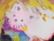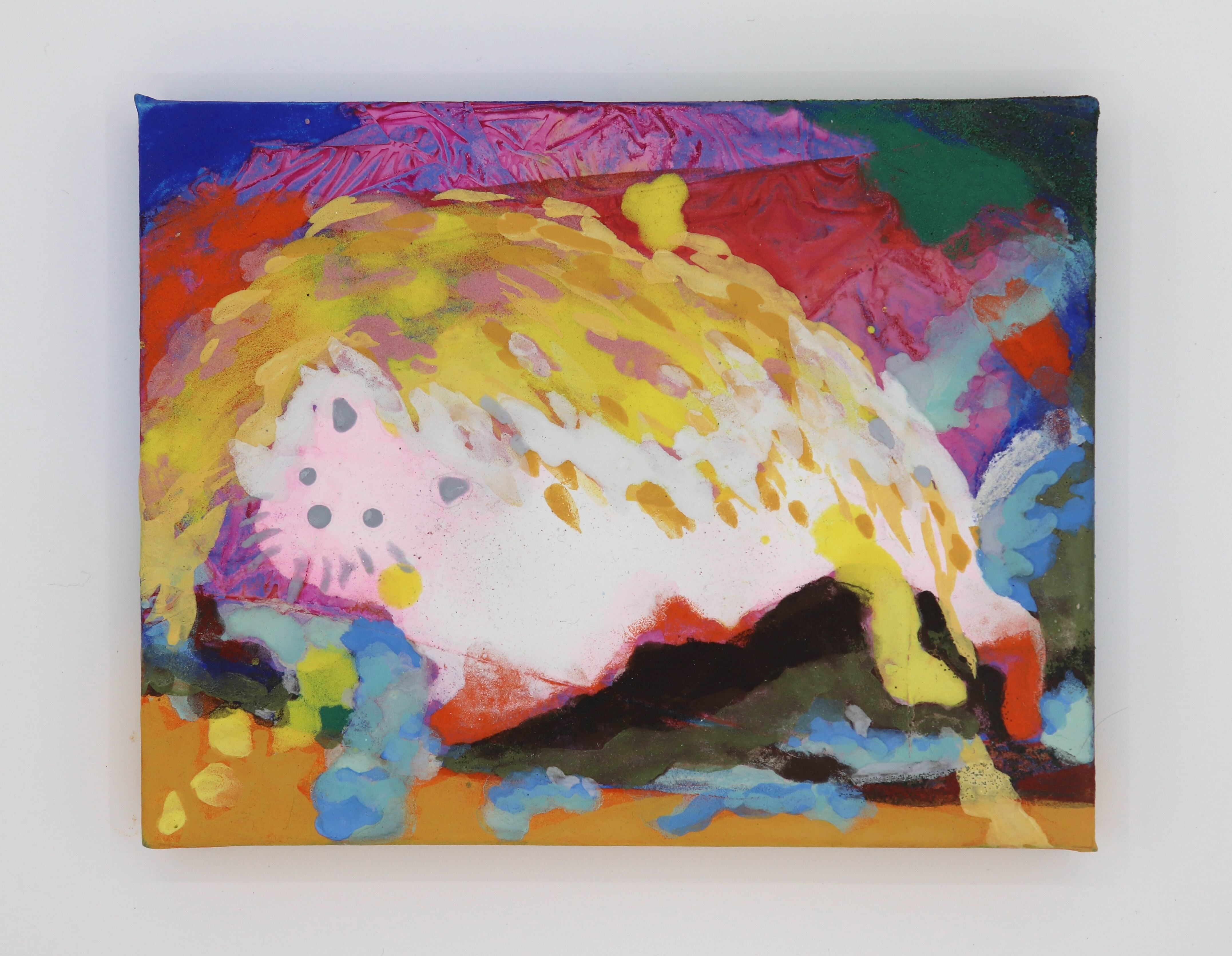 14x18cm(F0号)の作品は、大きな作品を描いた時に余った絵の具を塗り重ねながら、はじめは無意識に絵のイメージができていきます。絵の具を重ねているうちに、猫のような生きものが姿を現しました。ただ、その存在よりも周囲に感じた躍動感のほうが印象的だったため、動的なイメージを広げるように色を塗り重ねていきました。