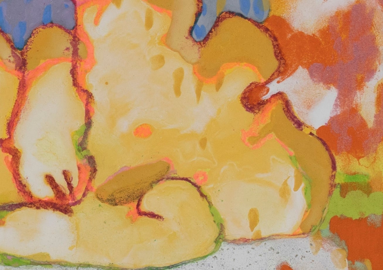 絵の下書きにパステルチョークを使うことがあります。普段はパステルの後が見えなくなるまで上から絵の具を重ねてしまいます。この作品ではパステルのがさがさとした線がイメージにぴったりきていたので、そのまま画面に定着させました。