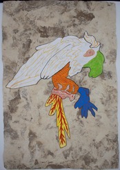 メキシコの民芸店へいくと、アマニ紙に描かれた民画が売られています。画風は違えども鮮やかな色合いと、程よいラフさは、日本でいう大津絵を思い出します。日本版のメキシコ民画として大津絵で用いられている水干絵具(泥絵具)を主流として、ドローイングのような軽快さで描きあげました。