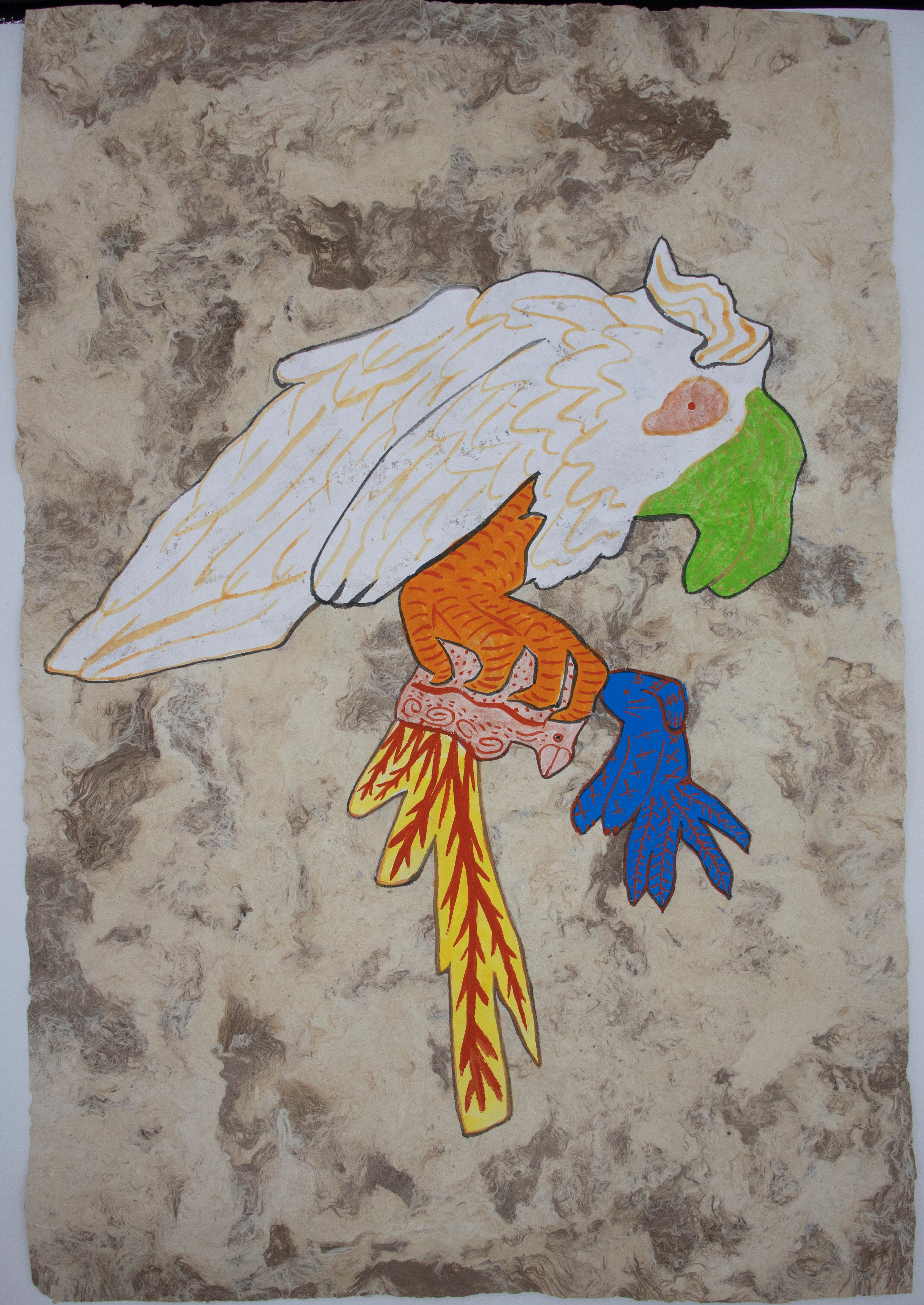 ⭐︎樹皮を延ばしたメキシコのアマニ紙に描いたシリーズです。街中のペンキが剥がれた壁の模様などからみえてきた、いきもののような形のイメージを描いています。