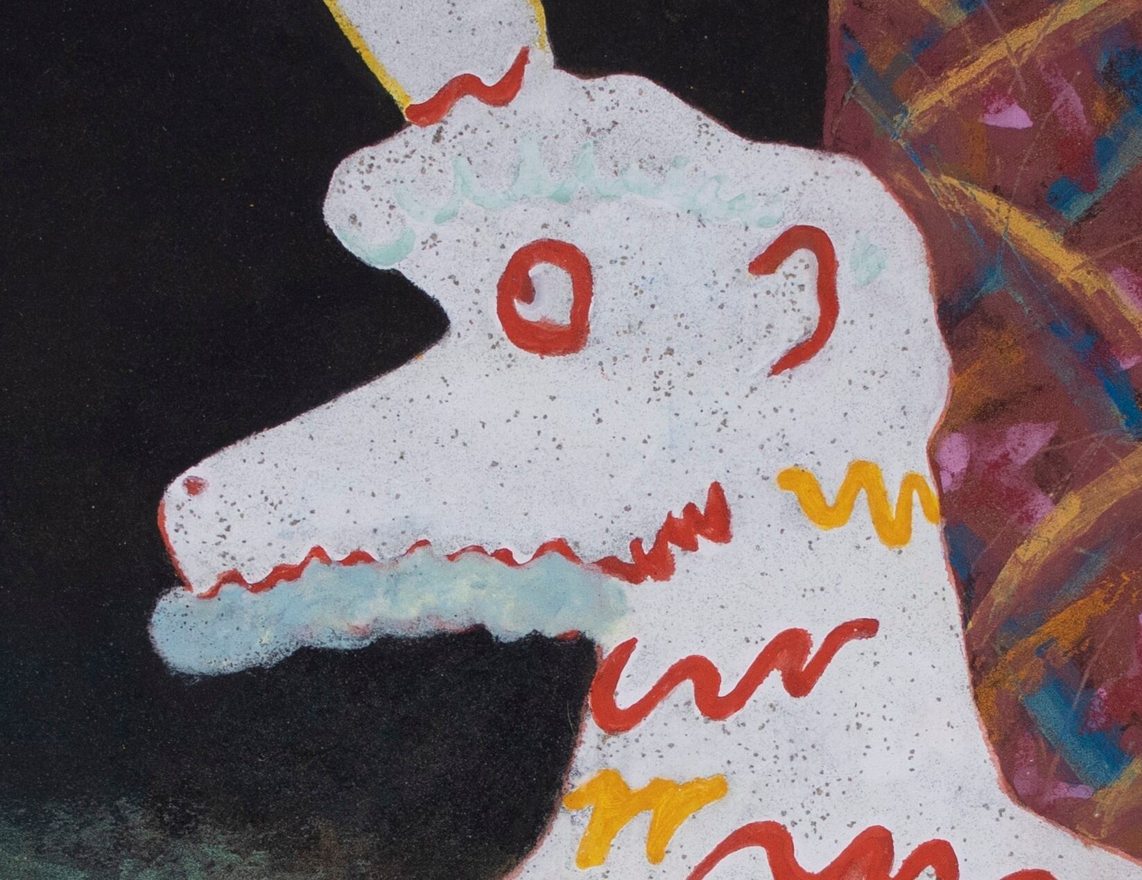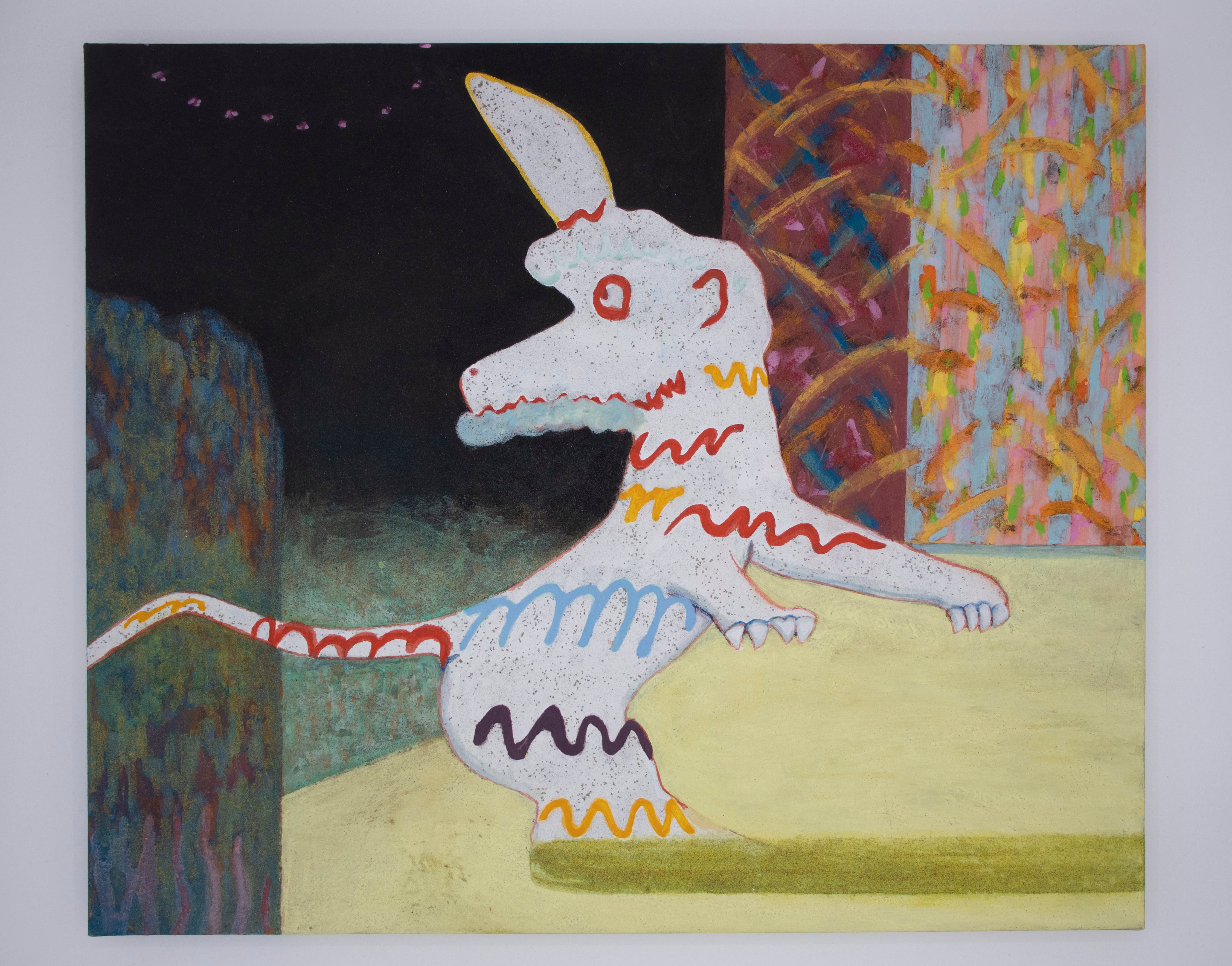 不思議ないきものの形と、それをとりまとう空間を描きました。白い絵の具(胡粉)を絵の上に垂らしたときにみえてきたいきもののような形から画面を描き進めています。もともとは足も描いてありましたが、最終的にそこを隠してしまう事で自分の中でしっくりとくるバランスになりました。