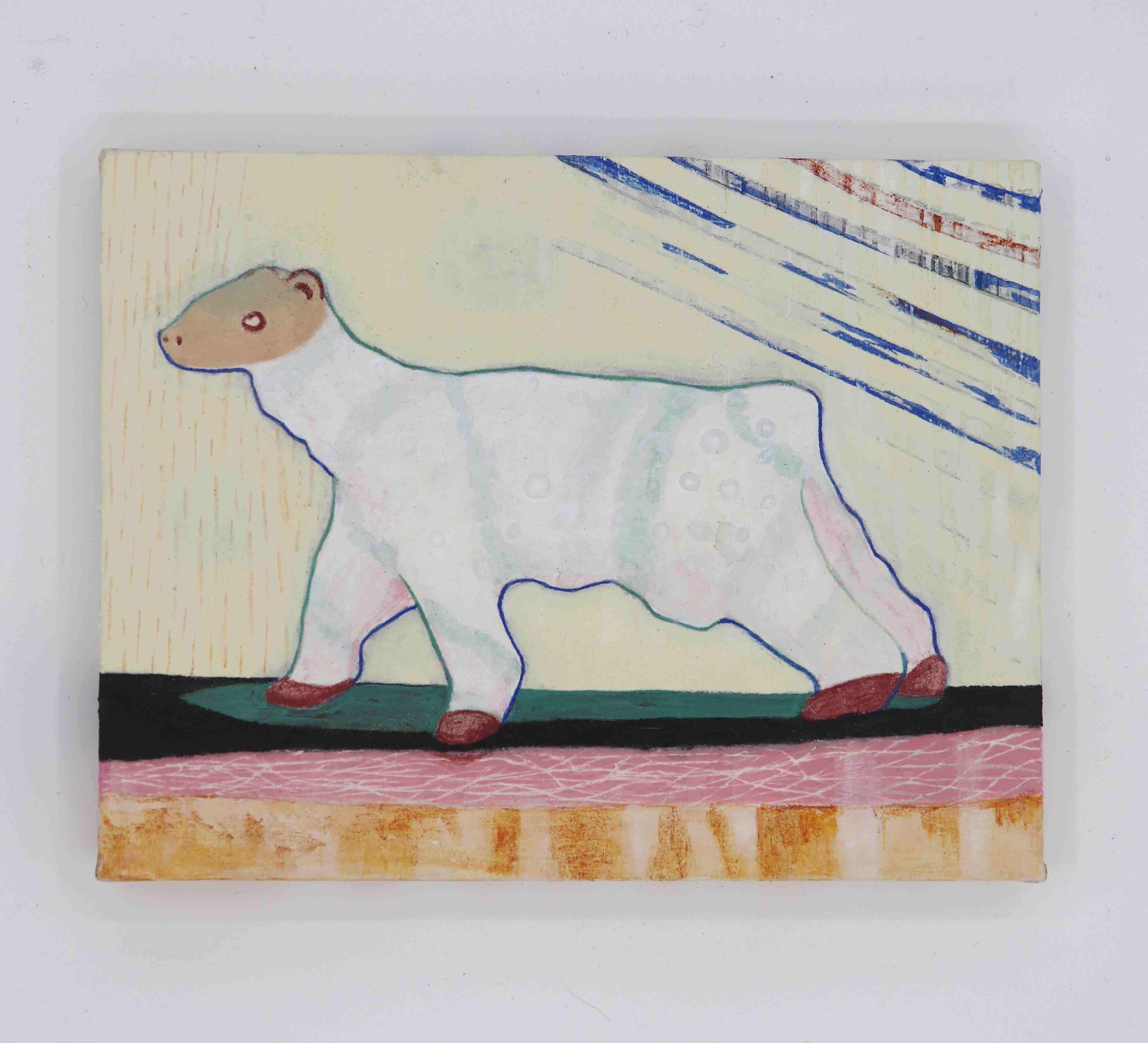 スーブニール=民芸品のような生き物が浮かんできたので、そのまま描きました。画面下の赤い色が滲んだような表現を入れることで平面的ながら、手前と奥の空間を感じられるように工夫しています。