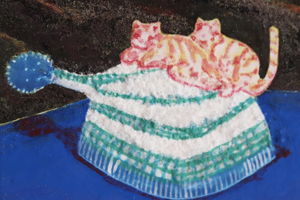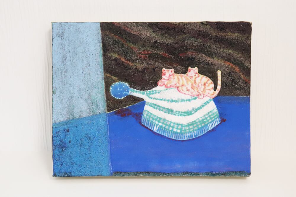 本作品は「岩絵の具」と呼ばれる素材を用いて描いています。光の当たり方により粒子の大きな「岩絵の具」は乱反射しキラキラとした表情になります。写真では実物の持つ質感を十分にお伝えすることが難しいため、ご同意の上お求めください。